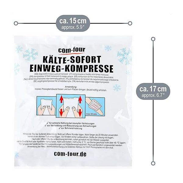 • SNELLE BIJSTAND: Wegwerp onmiddellijk koud kompres voor onmiddellijke, snelle koeling en voor eerstehulpmaatregelen. Koelt betrouwbaar 20 tot 30 minuten.