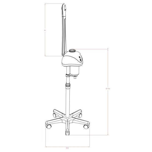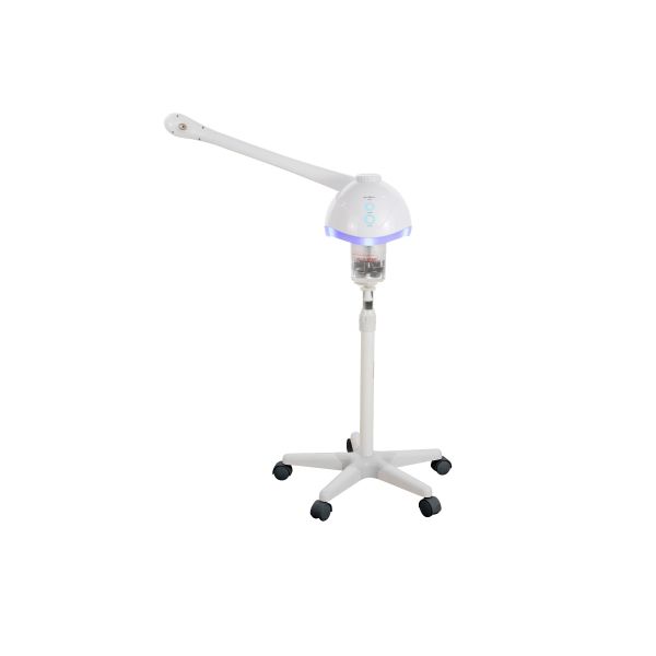 FACIAL STEAMER met een functioneel en eenvoudig ontwerp. Uitgerust met een zwenkarm en een draaibare kop met een houder voor aromatische oliën. Het apparaat bevat een kruidencontainer in het waterreservoir. Daarnaast is het in hoogte verstelbaar en beschikt het over een stabiele basis met wielen, waardoor het eenvoudig te verplaatsen is.