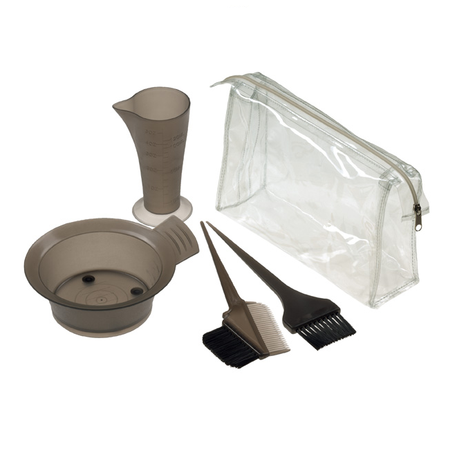 Met dit handige setje voor haarkleuring kan je gelijk aan de slag! In dit vijfdelige pakket zitten twee verfkwasten, een maatbeker, een maatbakje en een handige doorzichtige opbergtas.