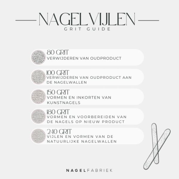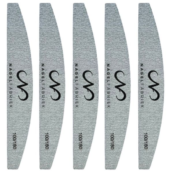 Deze halve maan nagelvijlen zijn te bestellen in 3 verschillende grit. Oplopend van 80 grit (grof) naar 240 grit (fijn). Een 80 of 100 grit vijl wordt vaak gebruikt voor het verwijderen van product. Een 180/240 grit vijl worden vaak gebruikt voor het inkorten en modeleren van de nagels. Deze halve maan nagelvijlen zitten per 5 verpakt.