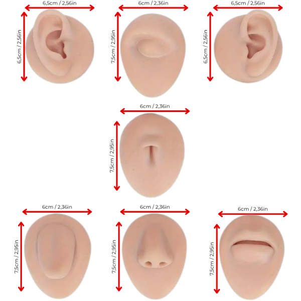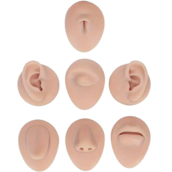 Deze set bevat flexibele en realistische 3D-modellen van lichaamsdelen, gemaakt van zacht siliconenmateriaal, specifiek ontworpen voor piercen. De modellen bieden een perfecte oefenomgeving voor piercers om technieken te oefenen.