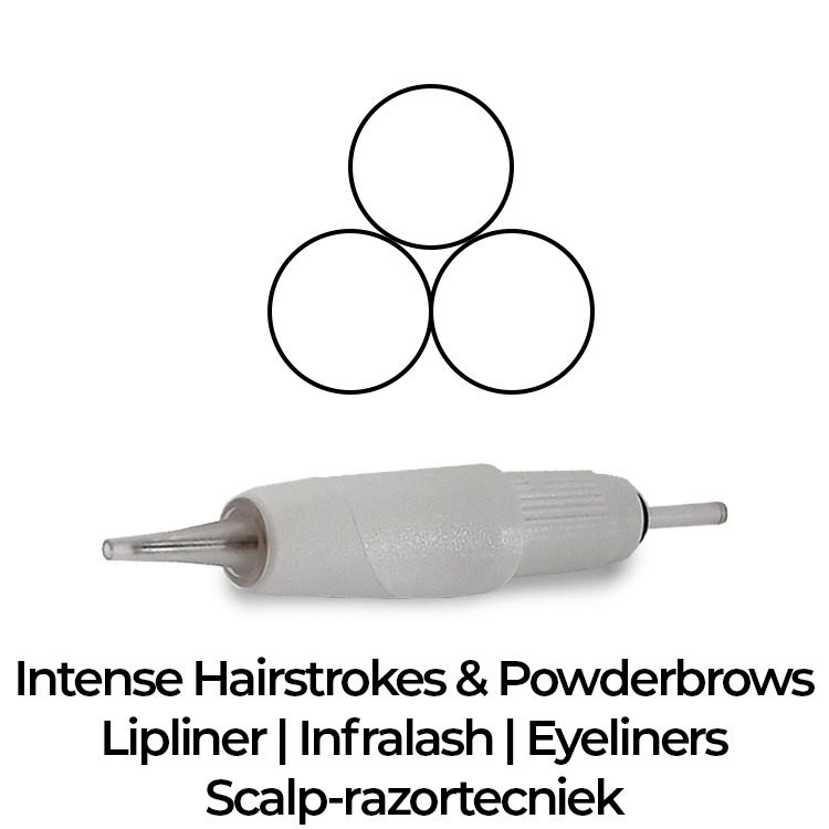 Deze 3-punts liner heeft een diameter van 0.25 mm. Er zijn 3 naalden aan elkaar gebundeld. Hierdoor is het mogelijk om dikkere en superstrakke lijnen te realiseren met 3 x zoveel pigment afgaven dan een 1-punts naald. Is van sommige de voorkeursnaald voor Hairstrokes en Powderbrows maar realiseert een intenser effect met iets minder detail dan een 1-punts naald. De ultieme naald voor het plaatsen van Infralash en subtiele Lipliners.