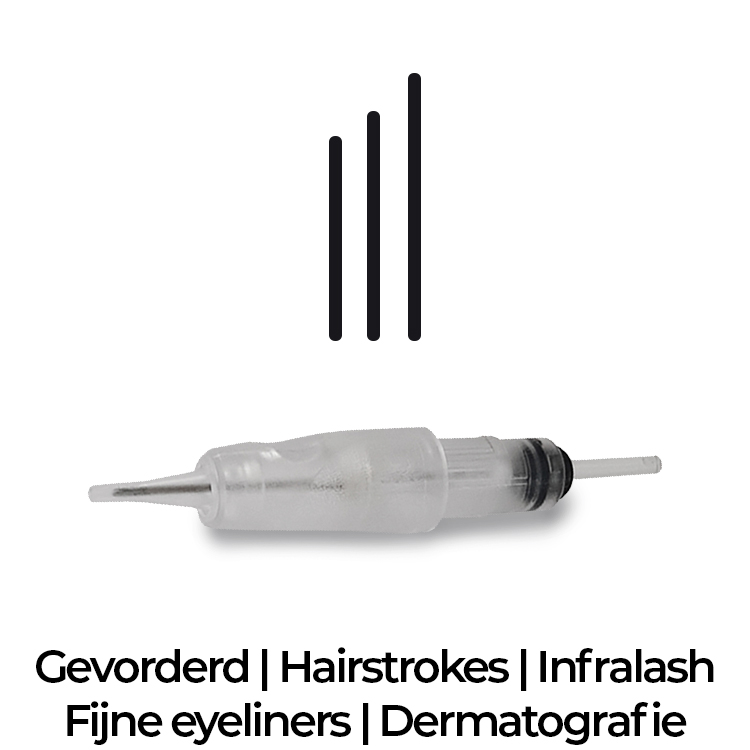 Deze 3-punts Sloped transparante naaldmodule heeft drie aflopende naalden naast elkaar. Iets fijner dan de 5-punts sloped naaldmodule. Typische voorkeursnaald voor gevorderden. Heeft hetzelfde effect als een 1-punts naald maar geeft 3 keer zoveel pigment af. Ideaal voor Hairstrokes, Infralash en verschillende principes binnen medische pigmentatie. Moet altijd in een bepaalde hoek gehouden worden zodat alle naaldjes de huid kunnen raken.