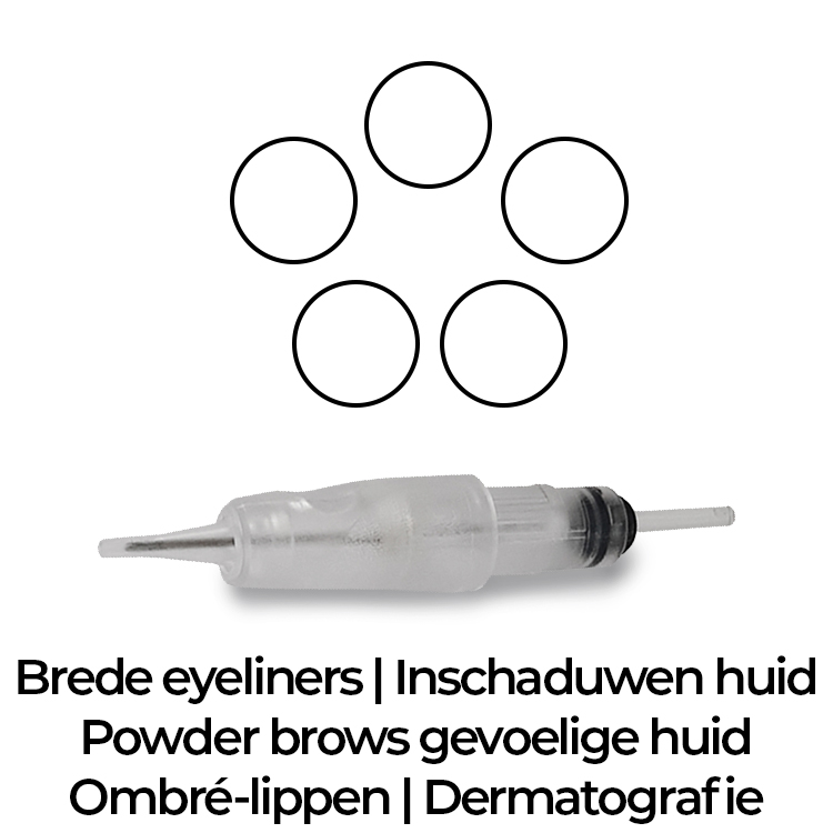 Deze 5-punts shader is ideaal voor het plaatsen van een brede eyeliners bij een gevoelige of dunne huid en het inschaduwen van kleine oppervlaktes. Kan ook worden gebruikt voor Powderbrows bij extreem dunne huiden, bij huiden onder invloed van bloedverdunners of bij huiden met diabetes. De naalden zijn gebundeld per 5 waardoor je een breed oppervlakte kun pakken. Shaders zijn minder scherp dan liners.