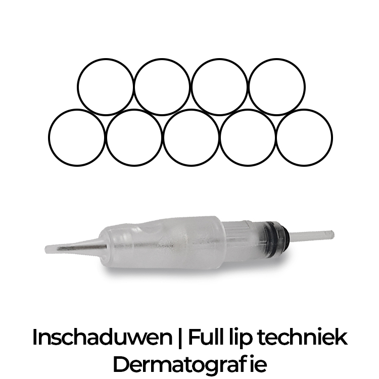 Deze naald werkt perfect bij het inschaduwen van grotere oppervlaktes. De naald pakt door zijn gebundelde 9 naaldmodules veel oppervlak en heeft een ultieme pigmentafgave. Te gebruiken bij het inschaduwen van de lippen voor een Full-lip techniek en de favoriete naald voor littekencamouflage, permanent concealer en andere vormen van Dermatografie.