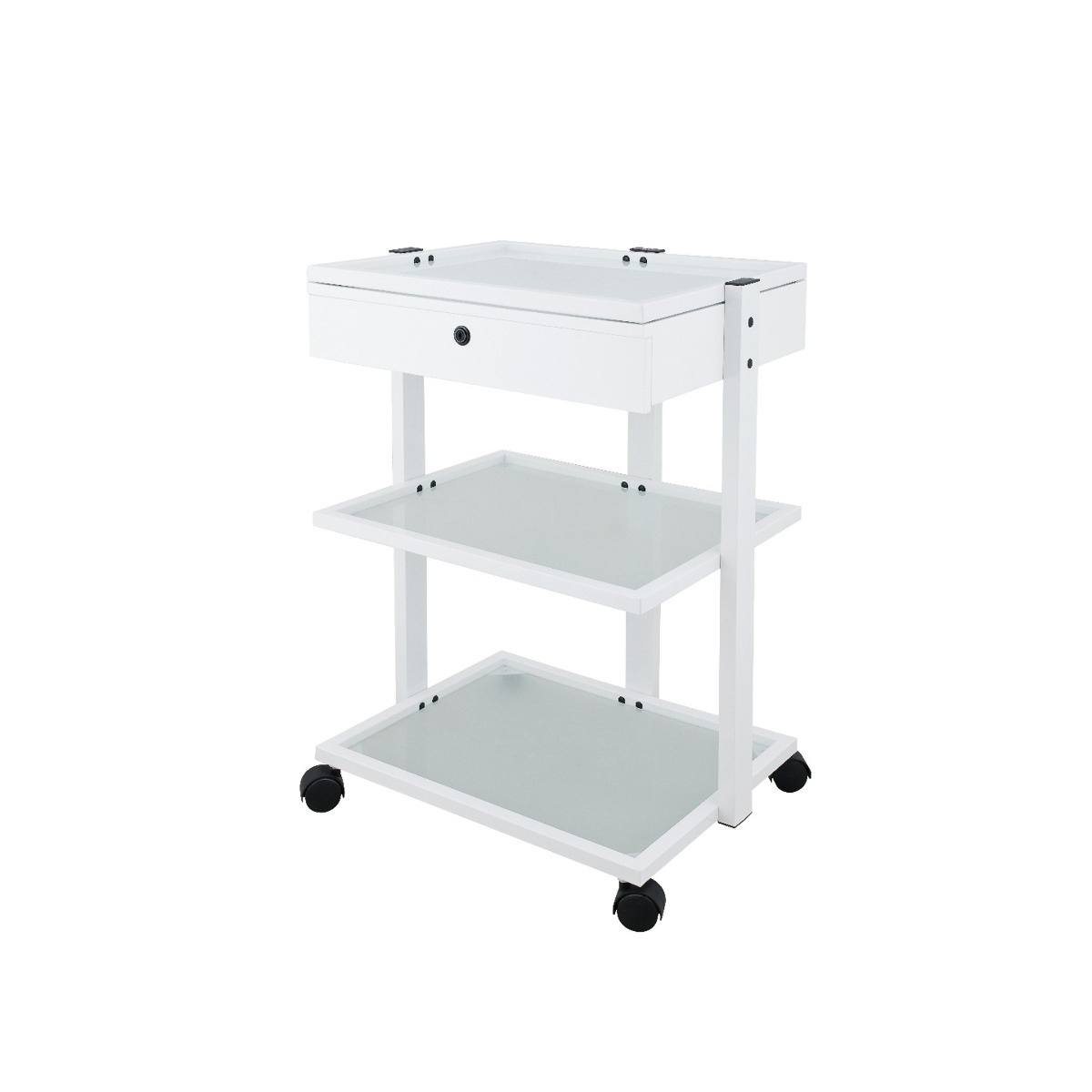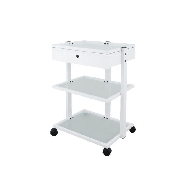 Anders dan de werkwagen ‘Facile’, is de werkwagen ‘Facile +’ voorzien van één afsluitbare lade. De beauty trolley is voorzien van een eenvoudig design met drie melkglazen platen met genoeg ruimte voor al jouw producten, materialen en apparaten. De platen zijn makkelijk afneembaar en de werkwagen past binnen ieder interieur. Het gat in het frame biedt plaats voor het plaatsen van een loeplamp. Dankzij de vier wielen is de werkwagen makkelijk te verplaatsen in jouw salon of praktijk.